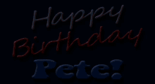 A vibrant neon sign lights up with the message "Happy Birthday Pete!" in white, red, and blue.