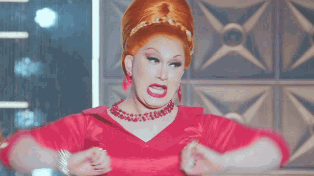 Jinkx Monsoon performs a joyful happy dance in a red dress on RuPaul's Drag Race All Stars.