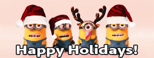 Four Minions characters, dressed in Santa hats and festive attire, wish everyone Happy Holidays.