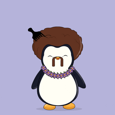 a penguin with a comb in its hair and a lei around its neck