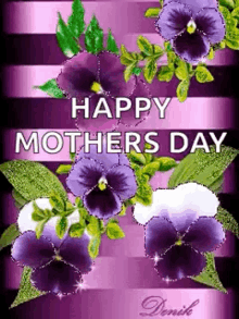 A vibrant Happy Mother's Day card featuring purple flowers and sparkling effects on a striped background.
