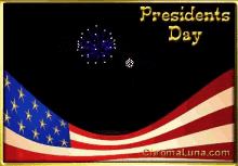 Animated greeting card for Presidents Day featuring fireworks and a waving American flag.