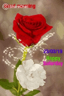 A vibrant red rose and white flower with a 'Happy Saturday' greeting and sparkling animation.