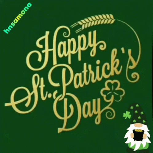 A festive greeting card wishing 'Happy St. Patrick's Day' with a gnome, shamrock, and pot of gold.