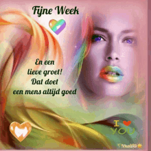 Vibrant image of a woman with rainbow lips and a Dutch greeting for a happy week.