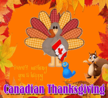 A festive cartoon turkey holds a Canadian flag, surrounded by autumn leaves, wishing everyone a Happy Canadian Thanksgiving.