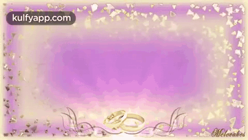 An animated greeting card with "Happy Wedding!" text, golden rings, and a purple and gold background.