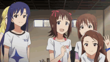 Haruka Amami and a group of anime girls, wearing white shirts with '765' logos, smile and wave cheerfully.