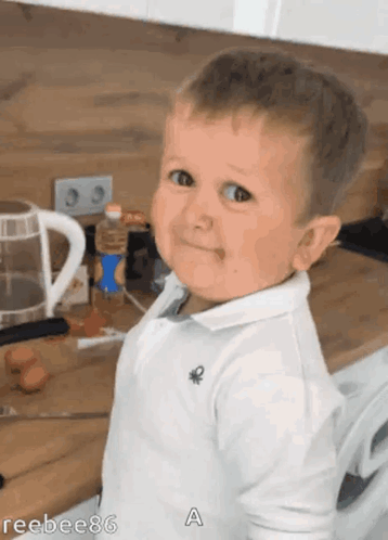 Hasbulla Magomedov, also known as Hasbik, makes a funny, cheeky face and winks at the camera in a kitchen setting.