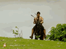 Rahil Azam as Hatim Tai, a warrior, rides his horse across a grassy field, ready for adventure.