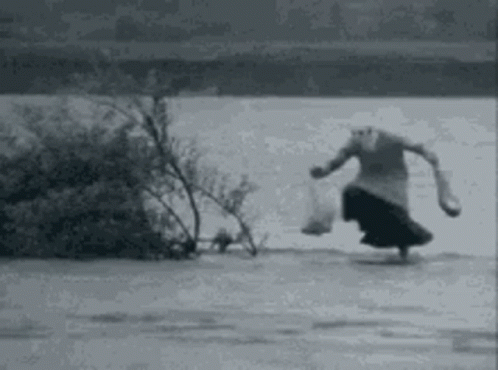 A person wades through deep floodwaters, carrying bags, after heavy rain has caused widespread flooding.