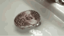 A cute hedgehog floats calmly in a white sink filled with water, slowly uncurling its head.