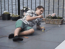 Hein Heinix relaxes outdoors, lying on a patio and playfully blowing soap bubbles by a body of water.