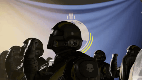 Helldivers soldiers in futuristic armor perform a powerful salute in front of the Super Earth flag.