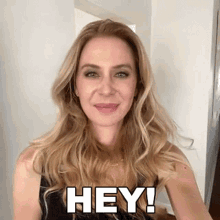 Actress Anne Dudek delivers a cheerful 'Hey!' greeting directly to the camera.