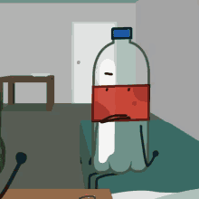 Hfjone Sodapack, a cartoon soda bottle character, sits with a sad and thoughtful expression in a room.
