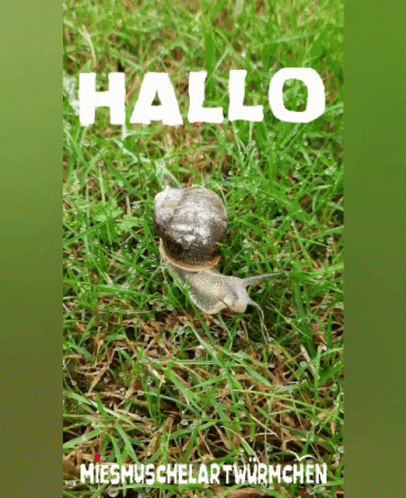 A charming snail is seen in green grass with the friendly word "Hallo" displayed.