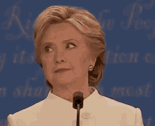 Hillary Clinton makes a funny and expressive face while speaking into a microphone during a political debate.