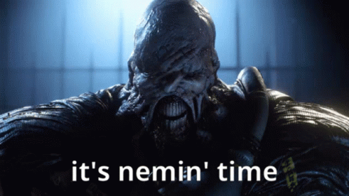 The terrifying character Nemesis from Resident Evil with the meme text 'it's nemin' time' overlaid.