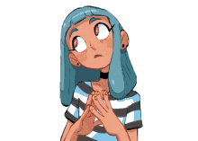 A cartoon girl with blue hair and pink eyes looks confused, clasping her hands together while wearing a striped shirt and choker.