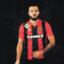 Footballer Tamás Krisztián posing confidently in his red and black Honvéd FC jersey.