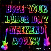 Vibrant graphic wishing a happy Labor Day Weekend, featuring a sparkling guitar and rainbow colors.