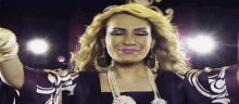 Kuwaiti actress and singer Huda Hussain performs a dance, adorned with elaborate jewelry and makeup.