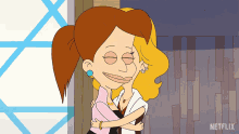 Two cartoon women, including Shannon Glaser from Big Mouth, share a warm hug and embrace.