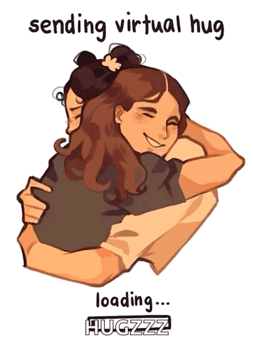Cartoon of two people hugging, sending a virtual hug with a loading animation that transitions to 'hug sent!'.