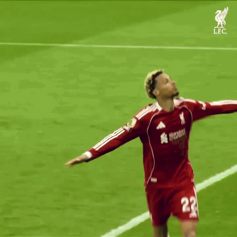 Hugo Ekitike celebrates his goal for Liverpool FC against Newcastle, pointing to the sky in triumph.