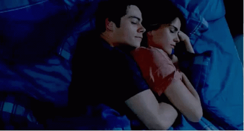 A man and a woman share a cozy embrace while sleeping peacefully in bed, captured in a dimly lit setting.