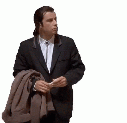 A man in a black suit, white shirt, and bolo tie looks around confused, holding a brown jacket, from Pulp Fiction.
