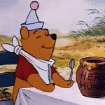 Winnie the Pooh, wearing a party hat and bib, happily prepares to eat honey from a pot.