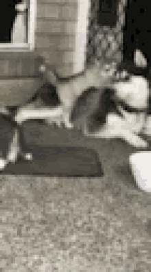 A husky dog watches as a clumsy puppy plays around a food bowl on the porch.