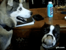 A vocal husky appears to be talking to a Boston Terrier, who watches intently.
