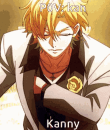 Hifumi Izanami from Hypnosismic, a blonde anime character, performs with a microphone, winking at the camera.