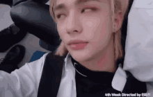 Hyunjin Skz from Stray Kids looks around, with a caption '4th Week Directed by Chan & In' visible.