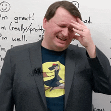 Alex, an English teacher, demonstrates the idiom "I am out of it" with a pained expression in front of a whiteboard.