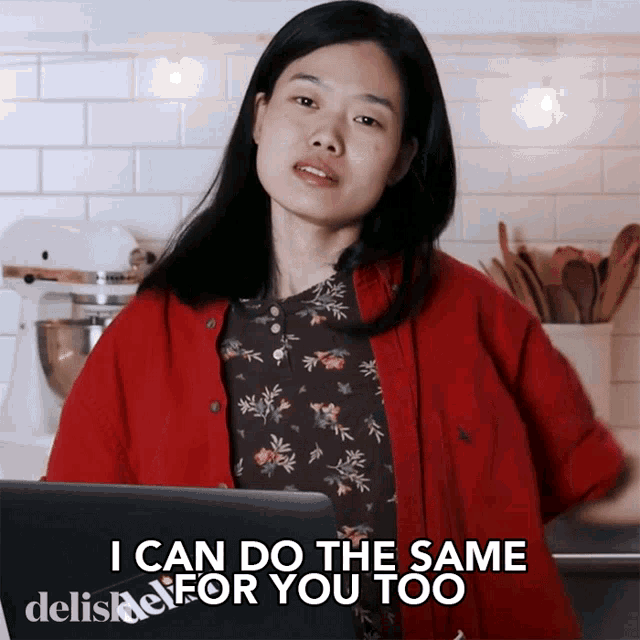 June confidently states 'I can do the same for you too' while pointing, in a bright kitchen setting.