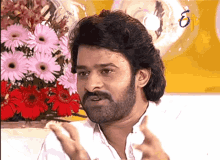 Prabhas, with a beard and long hair, speaks during an interview, surrounded by flowers.