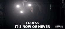 Ross Lynch in a dark scene, with the text 'I guess it's now or never' displayed on screen.