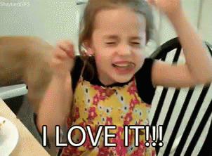 An excited little girl enthusiastically exclaims 'I Love It!' with a big smile.
