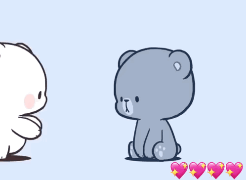 Two adorable animated bears share a loving hug, with sparkling hearts appearing in the corner.