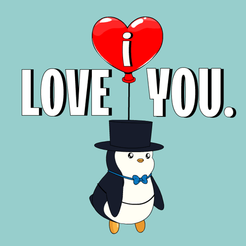 a penguin in a top hat is holding a red heart shaped balloon that says i love you