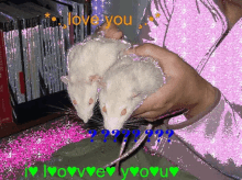 A person's hands hold two adorable white rats, with 'I Love You' written on their fingers.