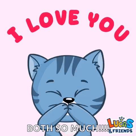 A cute blue cartoon cat from Lucas & Friends expresses love, holding a heart and saying 'I Love You Both So Much!'
