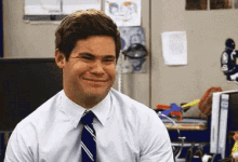 Adam DeVine makes an exasperated face in an office before the text "I QUIT!" dramatically appears on screen.