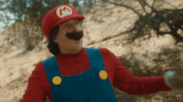 Austin, dressed as Mario, emphatically declares 'I Swear!' in an outdoor setting.