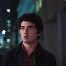 Ian Nelson as Young Derek Hale, looking thoughtful in a dark jacket with city lights in the background.