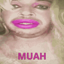 A person with bright pink lips and a blonde wig blows a kiss, with 'MUAH' displayed on screen.